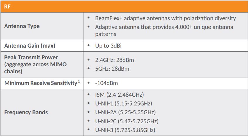 Mở rộng cường độ và vùng phủ sóng lên gấp 2 lần với công nghệ antenna Ruckus BeamFlex: cải thiện cường độ tương đối của tín hiệu so với nhiễu nền trong kênh truyền tín hiệu (signal-to-interference and noise – SINR) lên đến 6 dB và khả năng giảm tối đa việc nhiễu tín hiệu lên đến 15 dB.