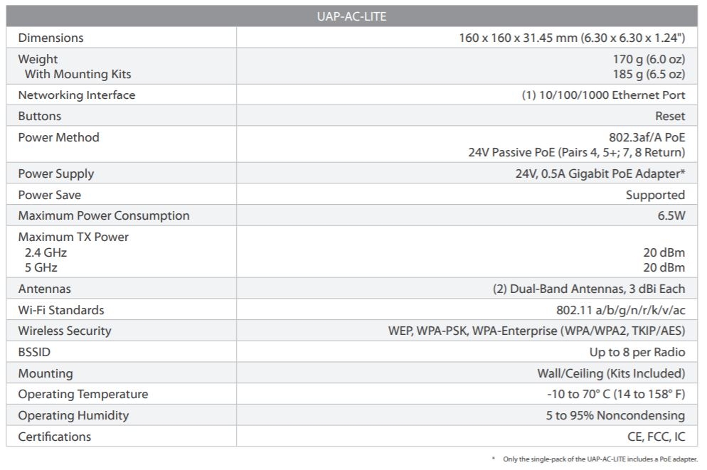 Ngoài ra UniFi AC Lite được trang bị chuẩn AC nên mang lại hiệu suất gấp 5 lần so với UniFi AP. Nhưng giá thành vẫn giữ được trong mức vừa phải. Kiểu dáng của thiết bị thu phát sóng wifi UniFi AC Lite được thiết kế khá đẹp và nhỏ gọn phù hợp để lắp đặt ở các địa điểm như: quán Coffee, nhà hàng, ….