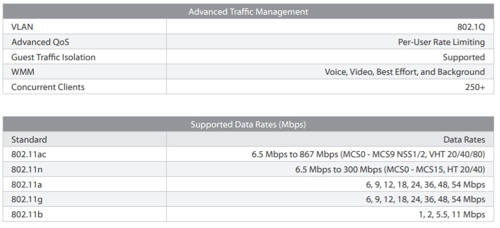 Hỗ trợ: VLAN theo chuẩn 802.11Q, WMM, giới hạn tốc độ truy cập AP cho từng người dùng